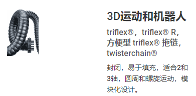 Triflex? R系統(tǒng)TRC.30系列 1. 可多維移動——在復(fù)雜移動中具有很高靈活性,甚至是在第6軸。 縱軸上每個鏈節(jié)可旋轉(zhuǎn)約± 10°。 這有助于 引導(dǎo)電纜通過有難度的幾何結(jié)構(gòu) 2. 通過特別的“拖車設(shè)計”(=球窩系統(tǒng))吸收大量拉力, 從而可在所有軸上平穩(wěn)運轉(zhuǎn), 經(jīng)測試?yán)蛇_(dá)2,340 N (TRC 100.145.0) 3. 卓越的機(jī)械特性——耐沖擊、防臟污、 結(jié)實、耐磨損、防碎屑。 借助光滑的內(nèi)外輪廓,滑過障礙物,并保護(hù)電纜。 在igus?實驗室中接受了超過100萬次循環(huán)的測試 4. 小彎曲半徑和小節(jié)距—— 實現(xiàn)節(jié)省空間的安裝 5. 輕松安裝和拆除——一個壓鑄部件, 因此安裝不費力。 牽引方向不需要 支承元件(如鋼纜、彈簧件等) 6. 超級穩(wěn)定——由于止動器位于外側(cè), 精準(zhǔn)止動器用于半徑和扭轉(zhuǎn)運動 7. 由于很容易將機(jī)器/機(jī)器人與智能附件相連,所以配置時間可降至最低